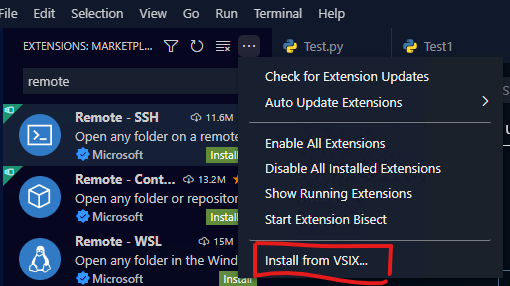 将新下载的扩展名包导入本地文件。安装后,“完成安装*从VSIX扩展”将显示在右下角。重新启动VSCode以生效。