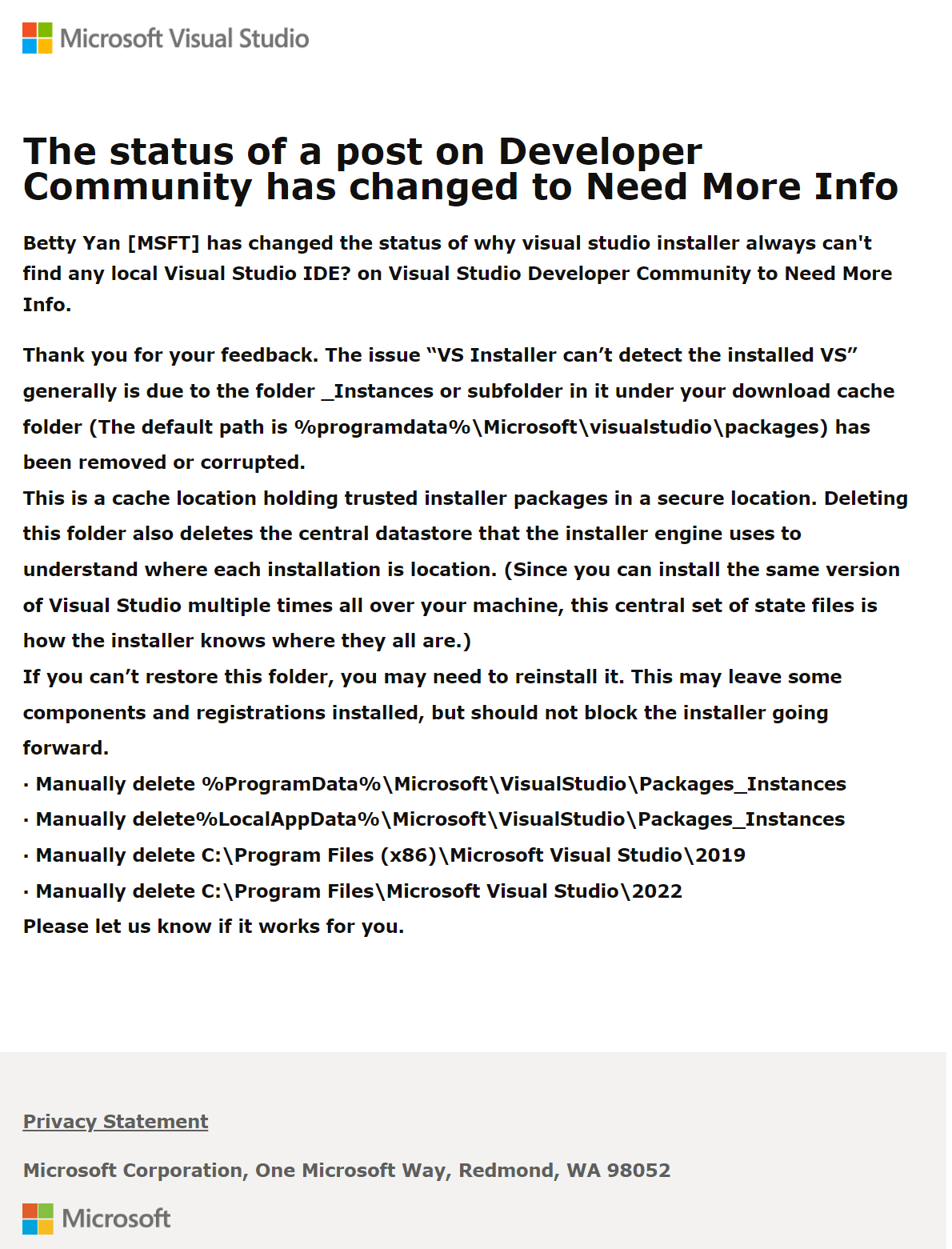 如果安装程序找不到vs2022,我就不能更新或卸载vs2022。我已经两次遇到这种情况,甚至尝试重新安装vs2022。但是我真的不想重新安装windows 10。如果有人遇到了同样的问题并解决了它,请告诉我,