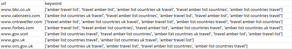 data = {'url': ["www.bbc.co.uk", "www.cabinzero.com", "www.cntraveller.com", "www.forbes.com", "www.gov.scot", "www.gov.uk", "www.ons.gov.uk"],