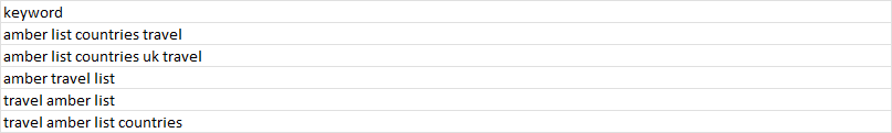 'keyword': ["['amber travel list', 'travel amber list', 'amber list countries uk travel', 'travel amber list countries', 'amber list countries travel']", "['amber list countries uk travel', 'travel amber list countries', 'amber travel list', 'travel amber list', 'amber list countries travel']", "['travel amber list', 'amber list countries uk travel', 'amber travel list', 'amber list countries travel', 'travel amber list countries']", "['amber travel list', 'travel amber list countries', 'travel amber list', 'amber list countries travel', 'amber list countries uk travel']", "['amber list countries travel', 'travel amber list countries', 'amber list countries uk travel', 'travel amber list', 'amber travel list']", "['amber list countries travel', 'amber list countries uk travel', 'amber travel list']", "['amber list countries uk travel', 'amber travel list', 'travel amber list countries', 'amber list countries travel']"]}