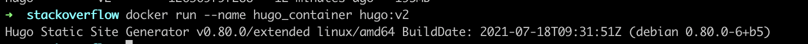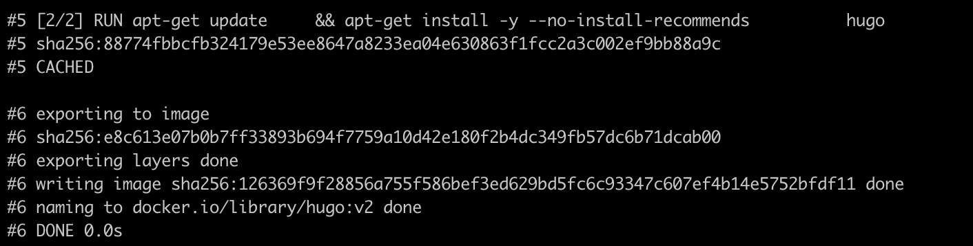 $docker image prune -a在这一步之后,您将能够新地执行所有构建步骤,并能够看到RUN hugo version的输出。