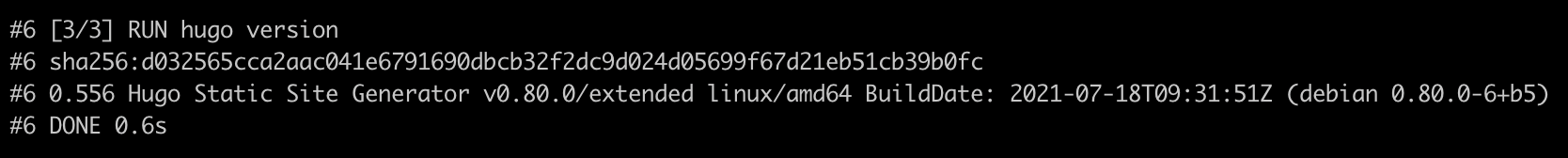 #6 0.494 Hugo Static Site Generator v0.80.0/extended linux/amd64 BuildDate: 2021-07-18T09:31:51Z (debian 0.80.0-6+b5)