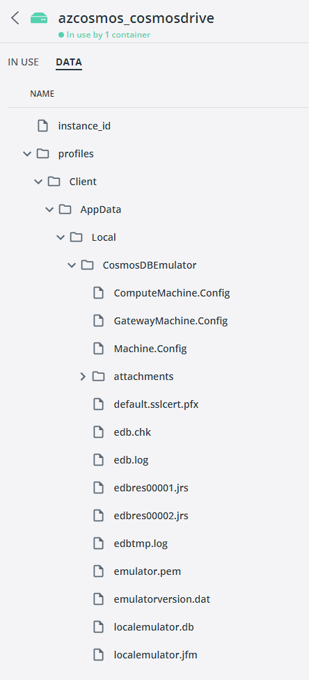 C:/CosmosDB.Emulator/bind-mount我已经查看了正在运行的映像,但是我不知道在哪个目录数据库/数据文件中存储.