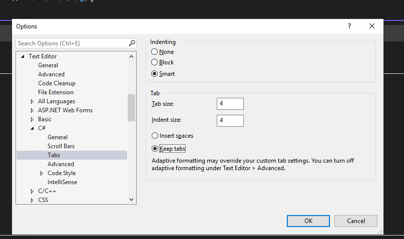 我想更改visual studio上的默认缩进。我希望它总是使用制表符而不是空格。我看过的每一件事情都没有告诉我如何使选项卡成为默认选项卡,或者已经过时了几年。