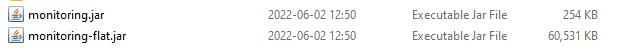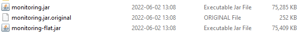 这两个文件“监控-平面. and”和"monitoring.jar“都是完全打包的。此外,我还看到文件"monitoring.jar.original“没有全部打包。