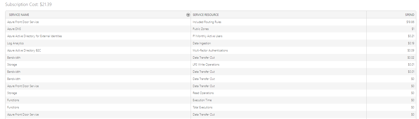 从订阅费用来看,我们不知道其中哪些服务是与哪些服务有关的。有多种存储、带宽和Azure前门服务。定价计算器也没有包括关于隐藏成本的警告。