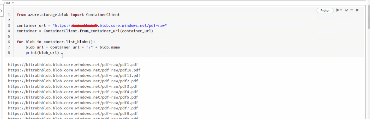 当我试图连接blob存储时,我得到了相同类型的错误。我只是按照下面的语法连接blob存储,并且删除了.json和其他一些.fott文件,只有容器中有PDF。我运行相同的代码,没有任何问题,它运行良好。请遵循下面的参考,其中有详细的信息。