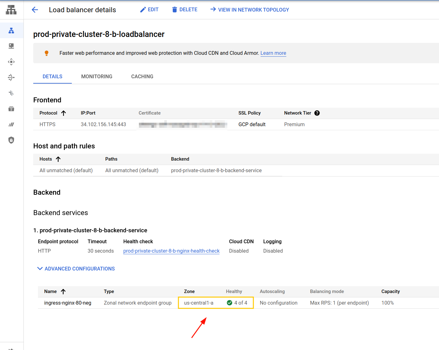 在需要HTTP(S) LoadBalancer之前,我只需要将NGINX页面提供的清单应用于Nginx控制器的安装,它将创建一个LoadBalancer类型的服务,然后自动创建一个区域性L4 LoadBalancer。