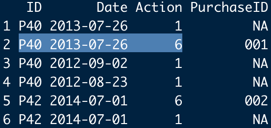 因此,对于具有ID=P40、Date = 26072013和Action = 6的行,将为这些行分配一个具有购买ID 1的新列。接下来,对于带有ID=P42的行,Date = 01072014和Action = 6,购买ID列中的值将一直滚动到2。那会很有帮助的!!太感谢了!!