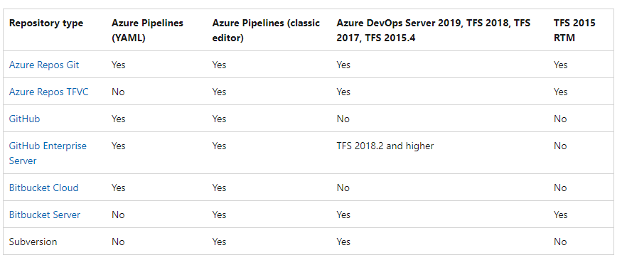 YAML管道是在Azure DevOps服务器2019年和Azure管道中引入的一种新的管道形式。YAML管道只适用于某些版本控制系统。下表显示了所有受支持的版本控制系统和支持YAML管道的系统。