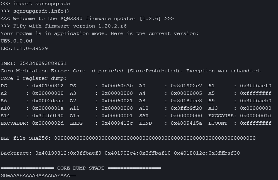 我有一个FiPy板与Expansionboard 3.1开发板。我成功地更新了两个板的固件(它们以前没有工作),并且能够用LoRa连接到TTN。我想连接到PyBytes与LTE,并有一个沃达丰NB-IOT在插槽.到目前为止,我还无法连接到任何程序,例如,在此链接上运行程序还没有导致连接,所有尝试都会导致核心转储。下面是在运行sqnsupgrade.info()以获取调制解调器信息时产生的核心转储: