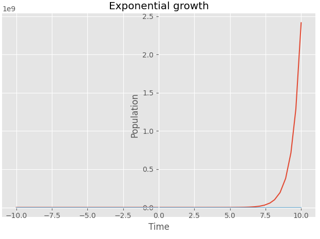 它从10开始,但是指数增长很快,所以你的地块有一个1e9垂直标度,这使得10看起来很小。这就是为什么指数增长的事物通常是以对数标度绘制的。尝试减少x限制或用yscale="log"绘图以获得更好的视图。