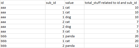 {'id;sub_id;value;total_stuff相关id和sub‘:'aaa;1;cat;10','aaa;1;cat;10',’aaa;1;狗;10‘,'aaa;2;cat;7',aaa;2;狗;7’,‘aaa;2;狗;7’,'aaa;3;cat;5',血脑b;1;熊猫;20‘,’血脑屏障;1;cat;20‘,’血bbb;2;熊猫;12‘}