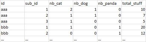 {'id;sub_id;value_cat;value_dog;value_panda;total_stuff:'aaa;1;2;1;0;10','aaa;2;1;1;0;7',‘aaa;2;1;1;0;7’aaa;2;1;1;0;7 'aaa;3;1;0;0;5',‘bbb;1;1;1;0;1;20','bbb;1;1;0;1;20','bbb;2;0;0;1;12'}