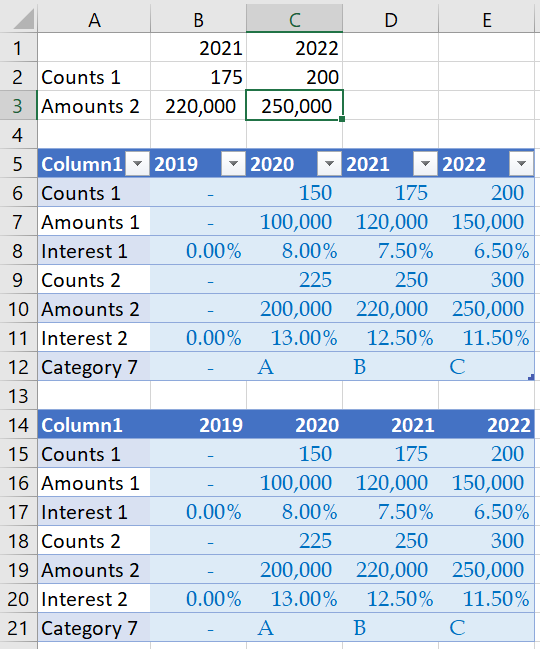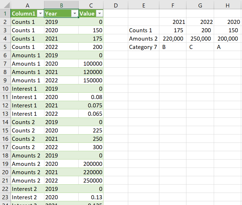 这对我来说是最有效的,但它涉及到使用Power查询,其中我将原来的表转换为一个转换的表(我将其命名为Clean_tbl),其中的年份在一列中下降,所有值都在另一列中。