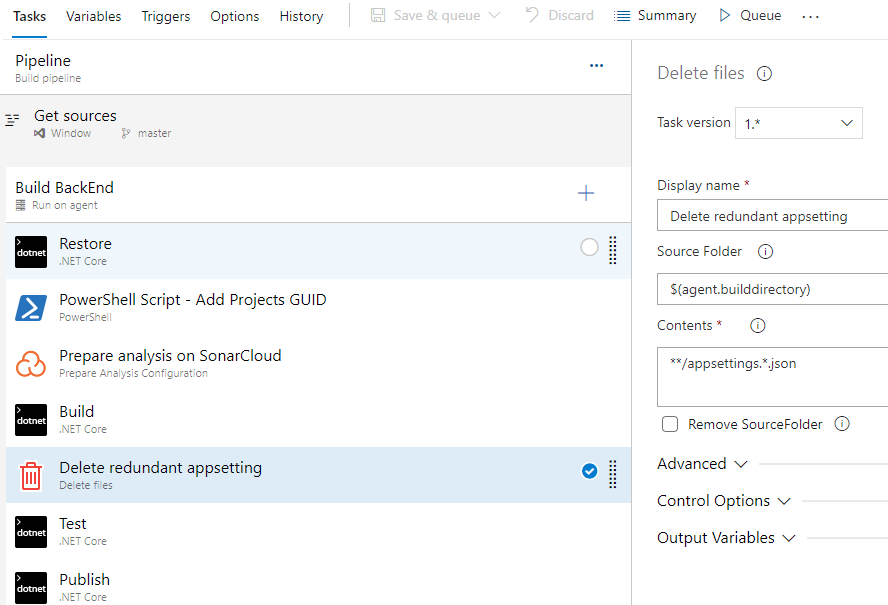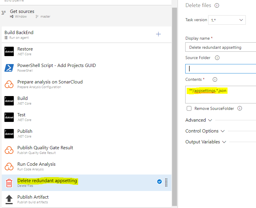 Contents: '**/appsettings.*.json'重要的是将DeleteFiles任务放在构建任务之后,如下所示: