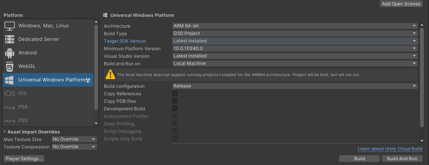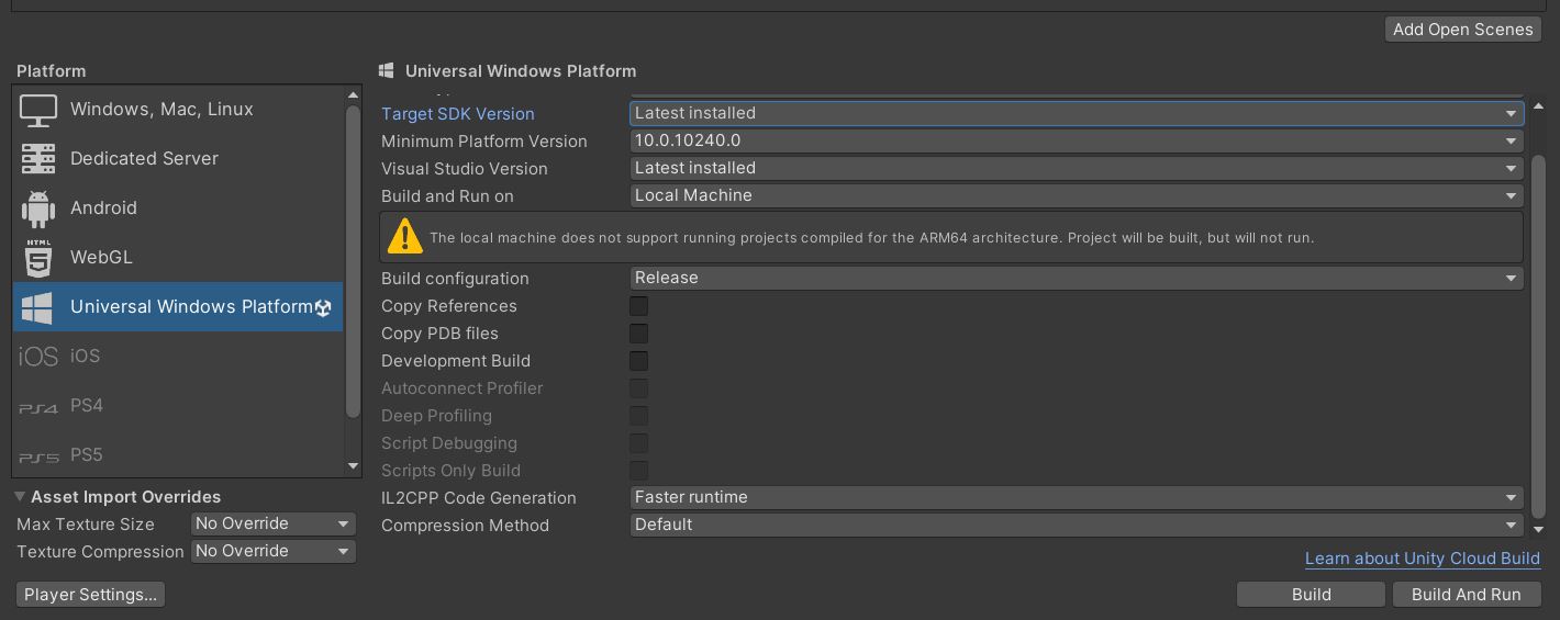 现在,我想将它部署到我的Hololens 2中。因此,我使用以下设置构建了该项目: