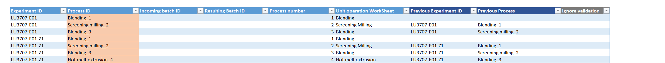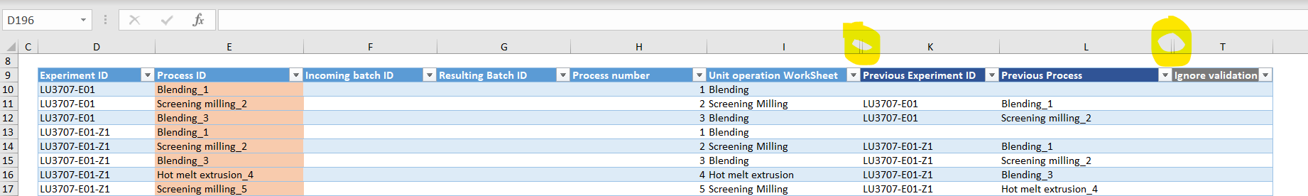 LU3707-E01#;#Blending_3#;##;##;#3#;#Blending#;#True#;#LU3707-E01#;#Screening milling_2因此,看起来表的索引似乎混合了,而rng(1, 7)实际上是针对列“忽略验证”(最后一列)。