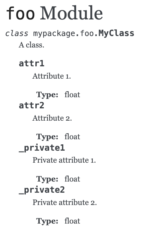 然而,在您的例子中,_private1和_private2只是文档字符串中的文本。我怀疑即使是斯芬克斯在这种情况下,也不知道它们是类的属性。