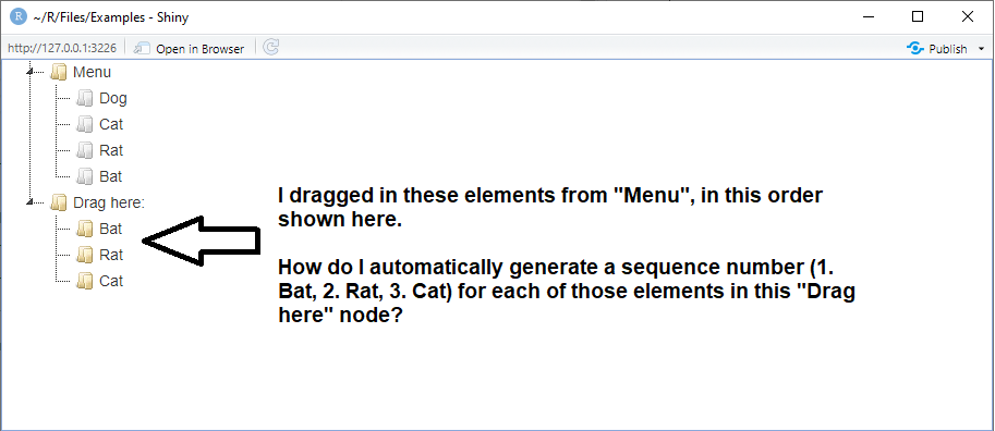 使用下面的可重复代码,我试图从“菜单”节点中将被拖动(或复制)到“拖动此处”节点的元素添加顺序编号。有什么办法吗?更好地解释在图片最下面的这篇文章。