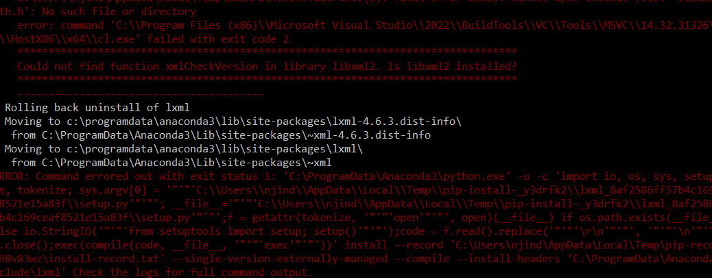 C:\Users\njind\AppData\Local\Temp\xmlXPathInitwd5ud9xh.c(1):致命错误C1083:无法打开包含文件:‘libxml/xpath.h.h’:没有这样的文件或目录 错误:命令C:\Program (x86)\Microsoft Visual Studio\2022\BuildTools\VC\Tools\MSVC\14.32.31326\bin\HostX86\x64\cl.exe‘退出代码2失败 无法在库xmlCheckVersion中找到函数libxml2。安装了libxml2吗?