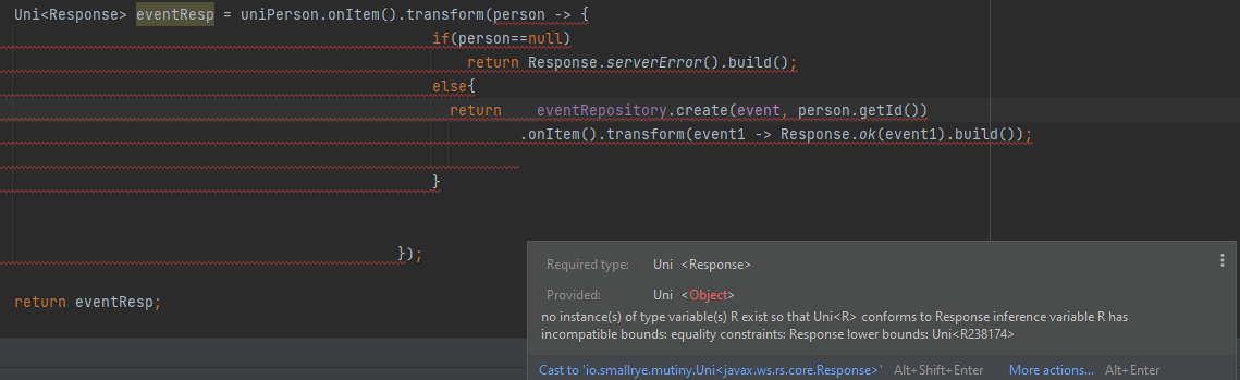 我需要首先检查这个人是否存在于MongoDB中。如果此人存在,则保存事件。如果person不存在,则创建错误状态并返回。我什么都试过了,但是我被卡住了,所需的返回类型是Uni,而所需的类型是Uni。我也尝试过使用transformToUni,但是它没有起作用。也尝试了很少其他方式,如onItemOrFailure()等,但似乎没有任何效果。