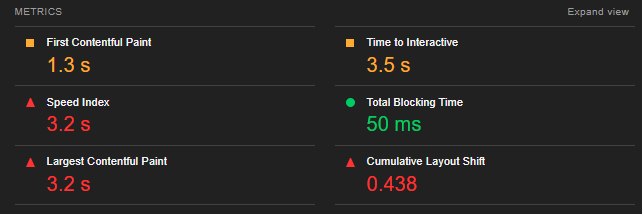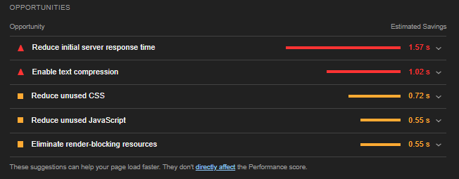 第二个图像中显示的度量是计算分数的标准,而不是第一个图像中的机会(尽管改进这些指标可能会帮助您得分)。web.dev (谷歌的一个资源,谁制造灯塔)有一些伟大的资源解释这些指标的含义和分数是如何根据这些指标计算的。这些指标结合在一起可以帮助您更好地了解页面的性能。
