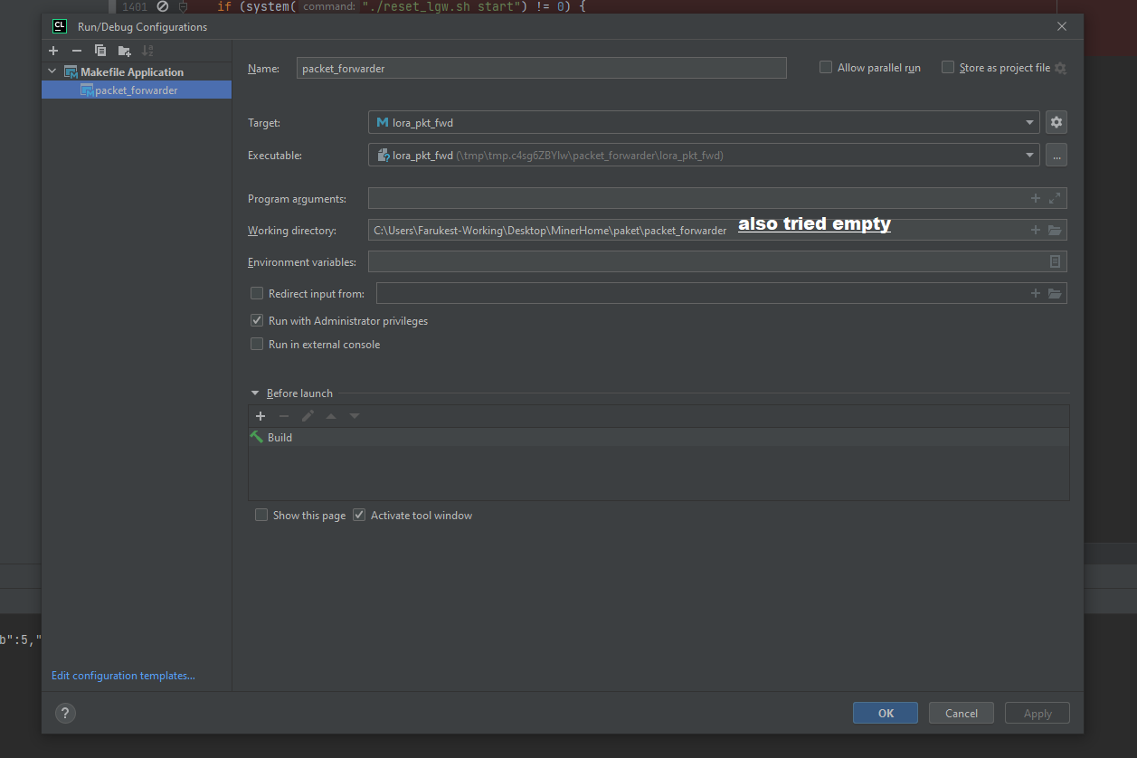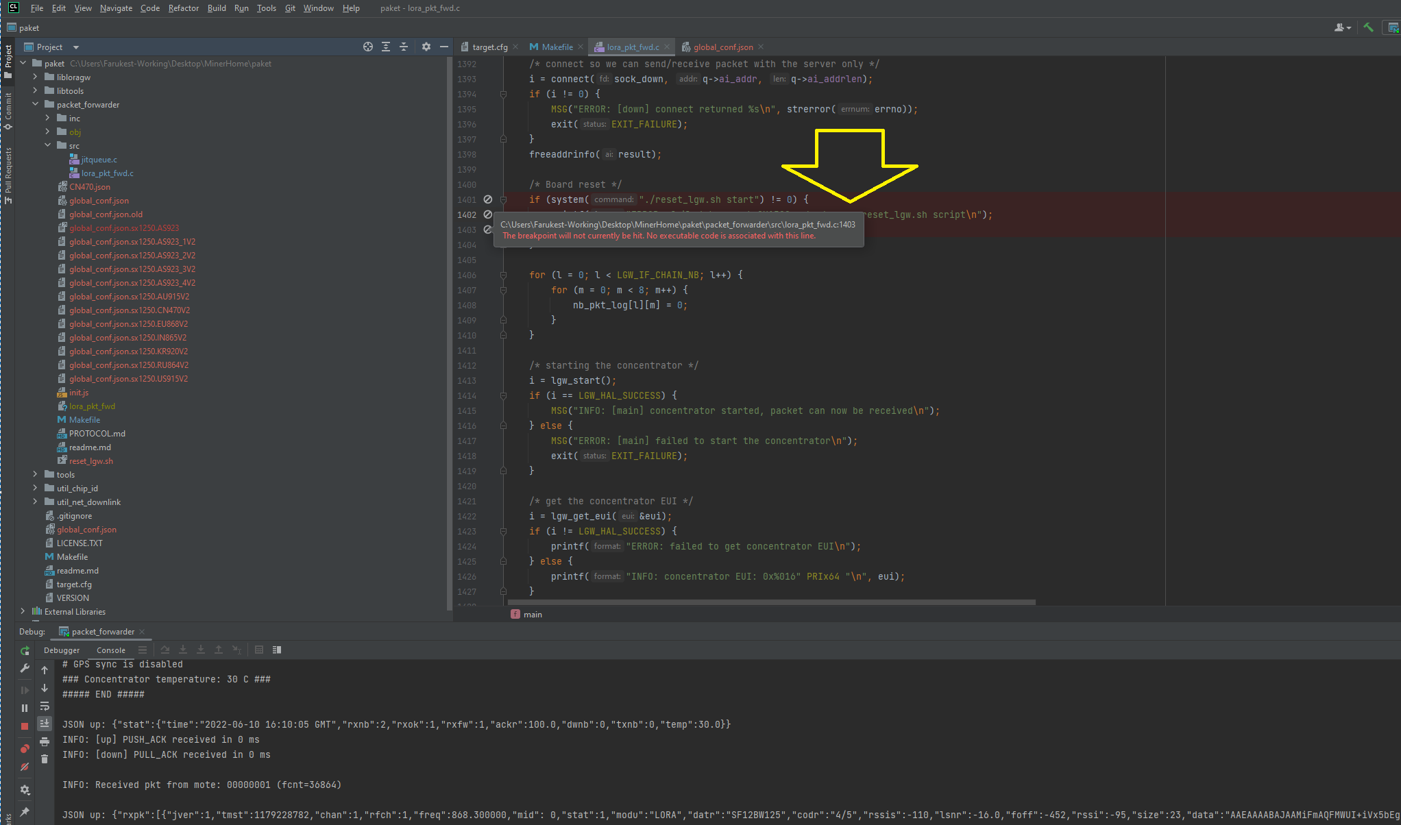 我在remote debugging上并不专业,实际上这是我的第二份工作,但这次是关于我的Raspberry pi Lorawan设备( Debian )上已经在工作的(现成的)项目。设备连接到我的家庭网络,其中有一个包转发器应用程序。应用程序监听1680端口。