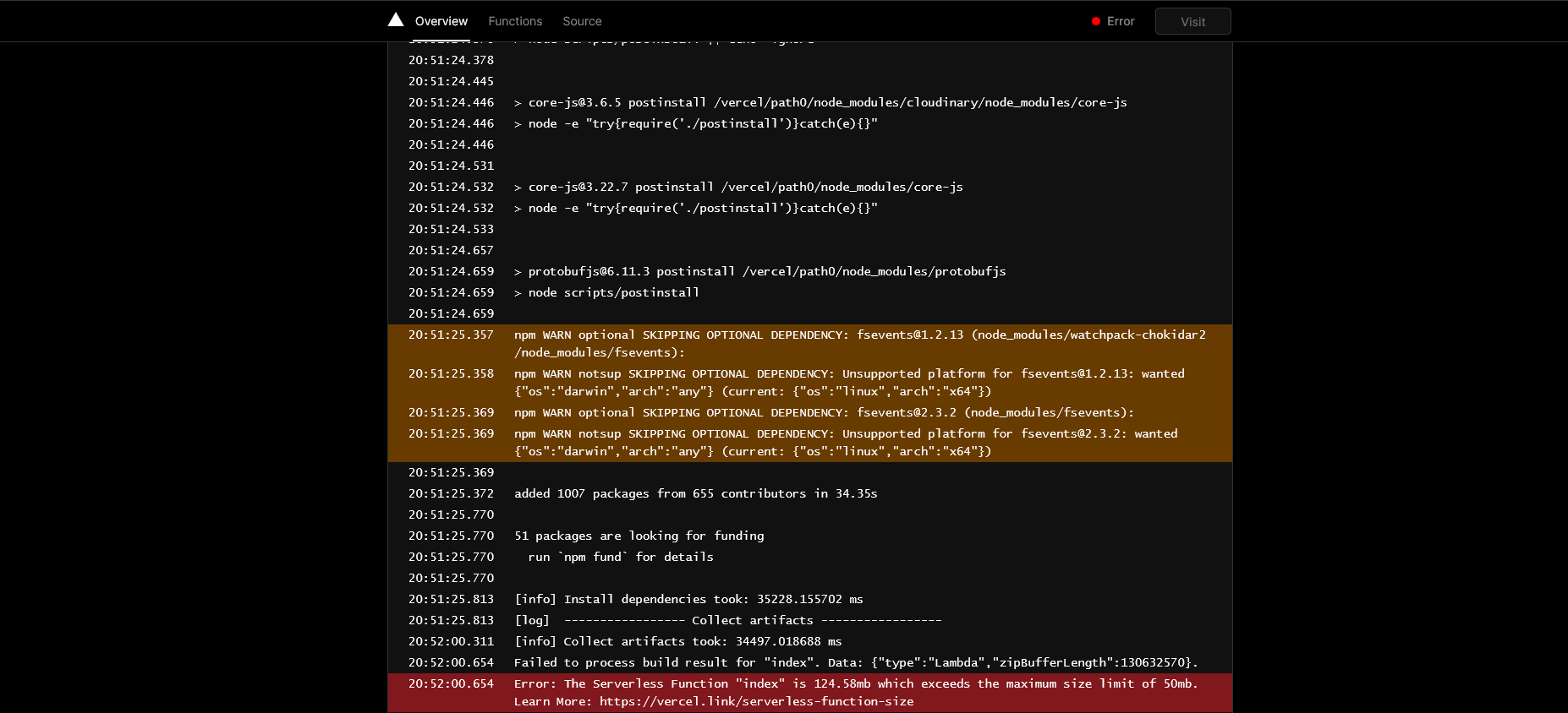 Error: The Serverless Function "index" is 124.58mb which exceeds the maximum size limit of 50mb. Learn More: https://vercel.link/serverless-function-size