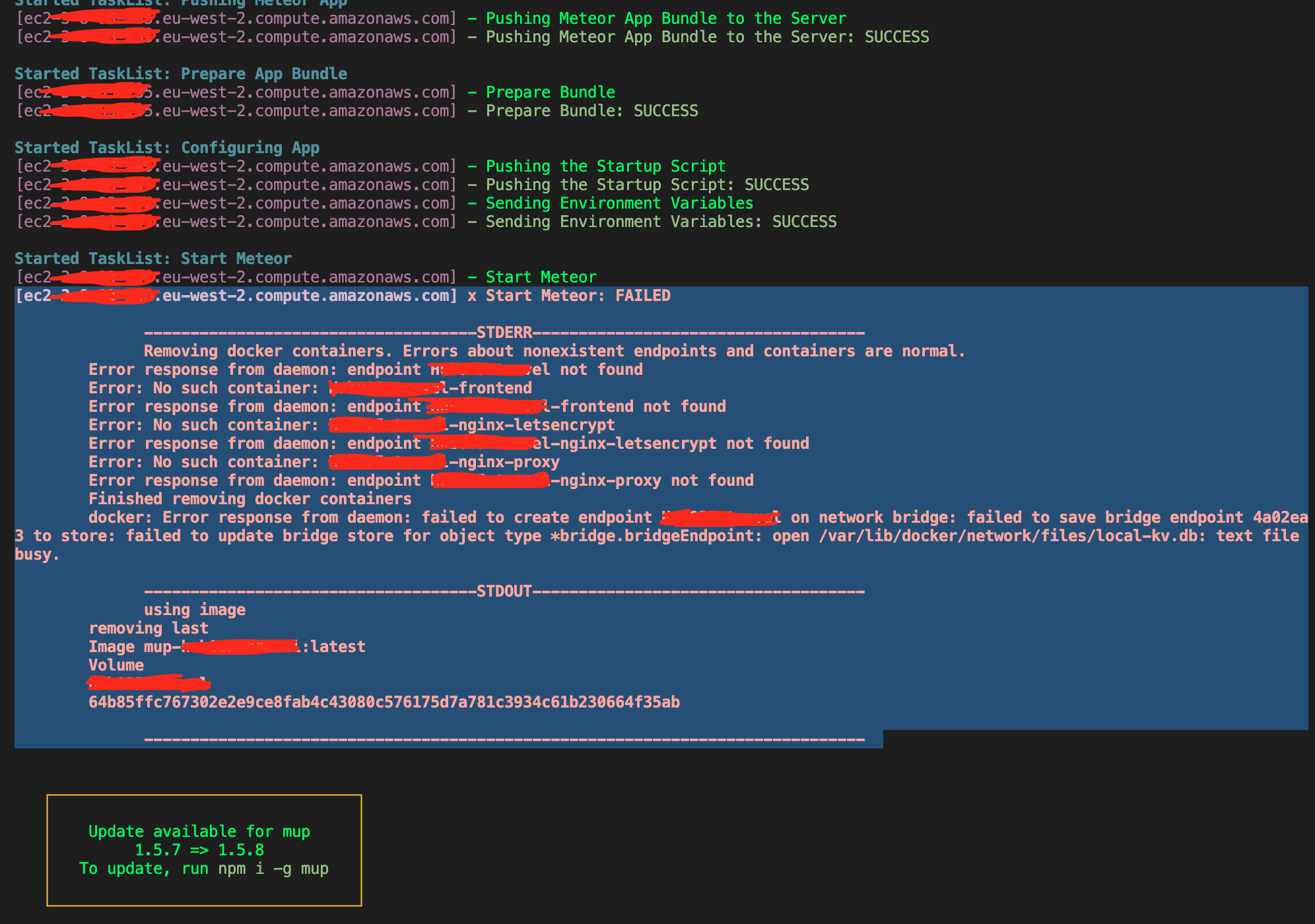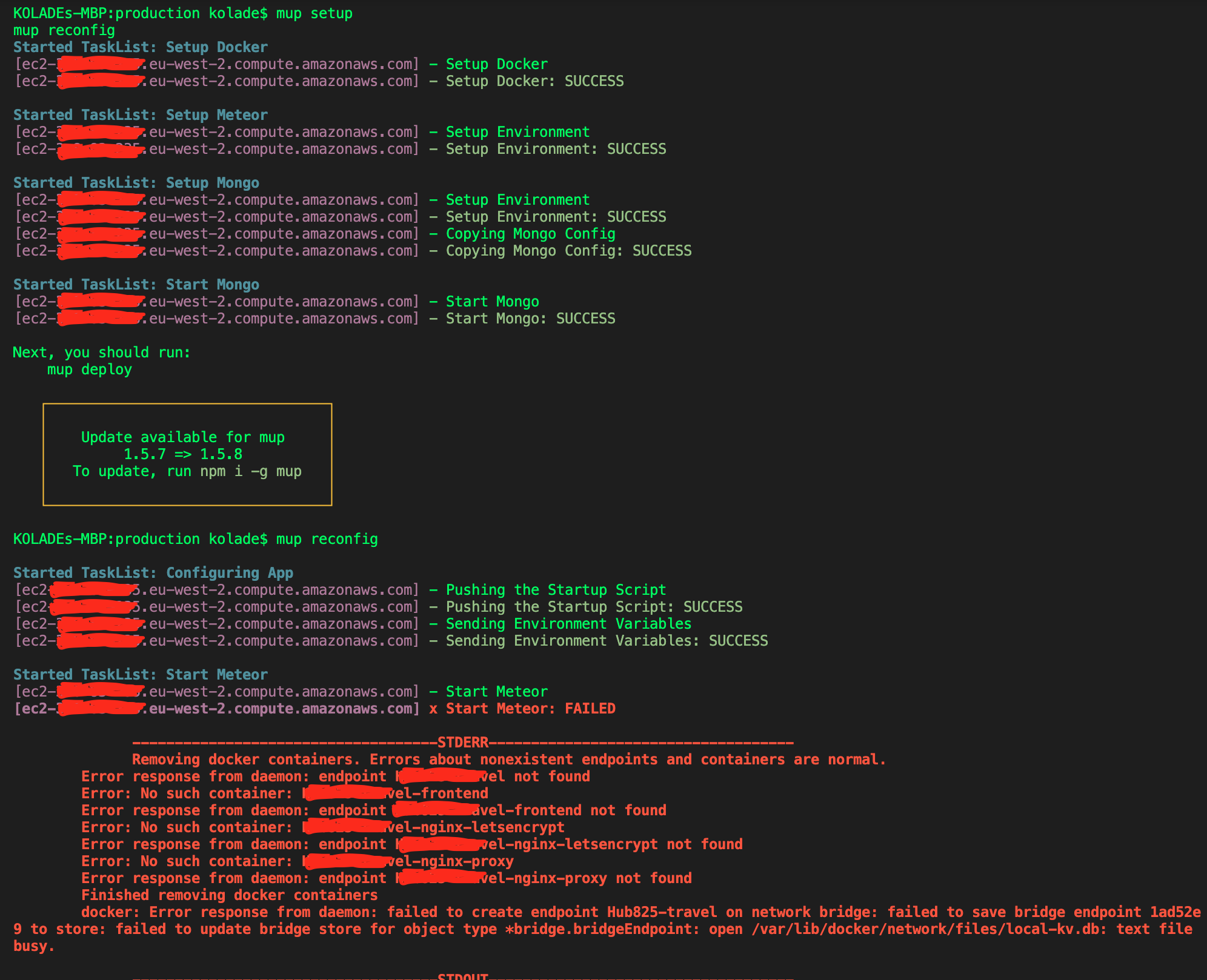 我成功地运行了mup setup命令,然后我尝试运行mup reconfig,得到了同样的错误,我在下面附加了错误的屏幕截图。