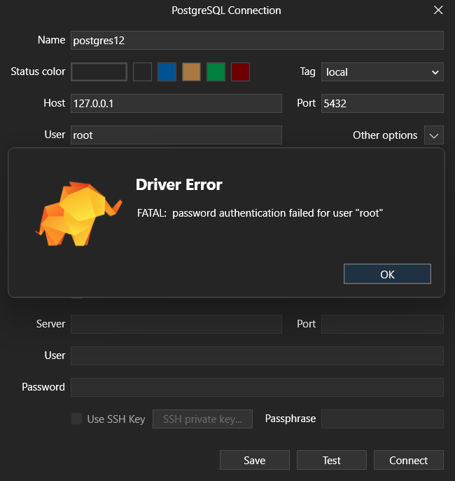 我创建了postgresql容器: docker -名称为postgres12 -p 5432:5432 -e POSTGRES_USER=root -e POSTGRES_PASSWORD=secret -d postgres:12--在使用tableplus时,即使在输入正确的密码之后也遇到了这个问题。