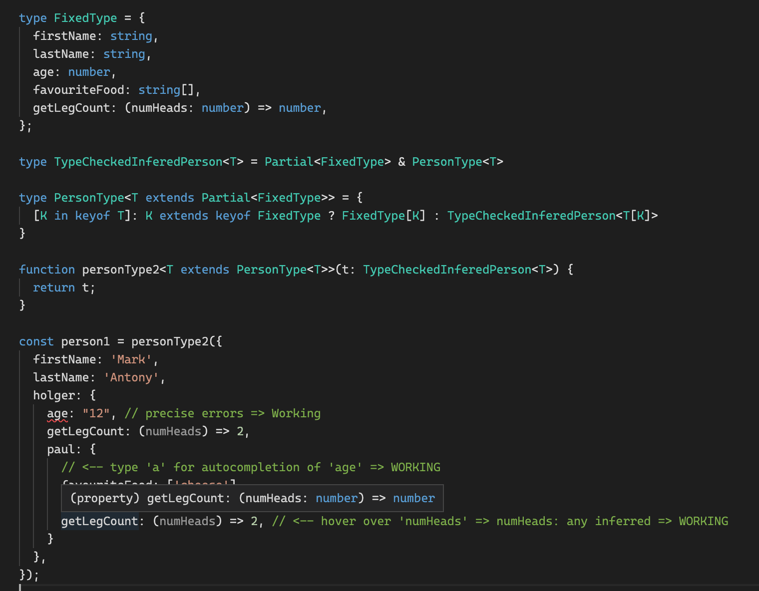 getLegCount: (numHeads) => 2, // <-- hover over 'numHeads' => numHeads: number correctly inferred => WORKING
