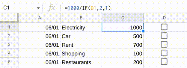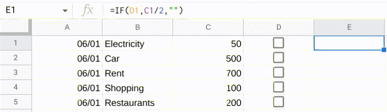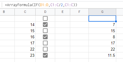 使用简单的IF公式,您只需检查复选框是否为真,如果是,则将C列上的当前值除以2,否则它将保持为空。