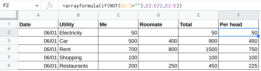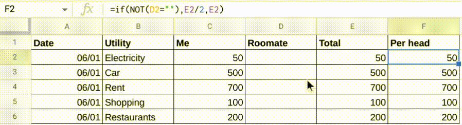 =if(NOT(D2=""),E2/2,E2)你有一栏为每个人的贡献/分裂。如果室友上的单元格是空的,那么它将保持为总价值,如果室友有一个附加值,那么它将被添加到总数中,并将其除以2。