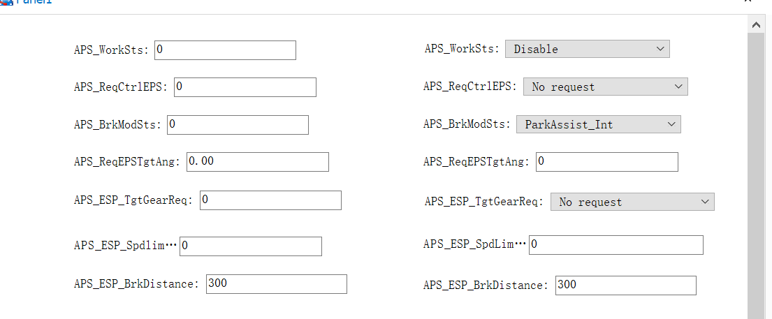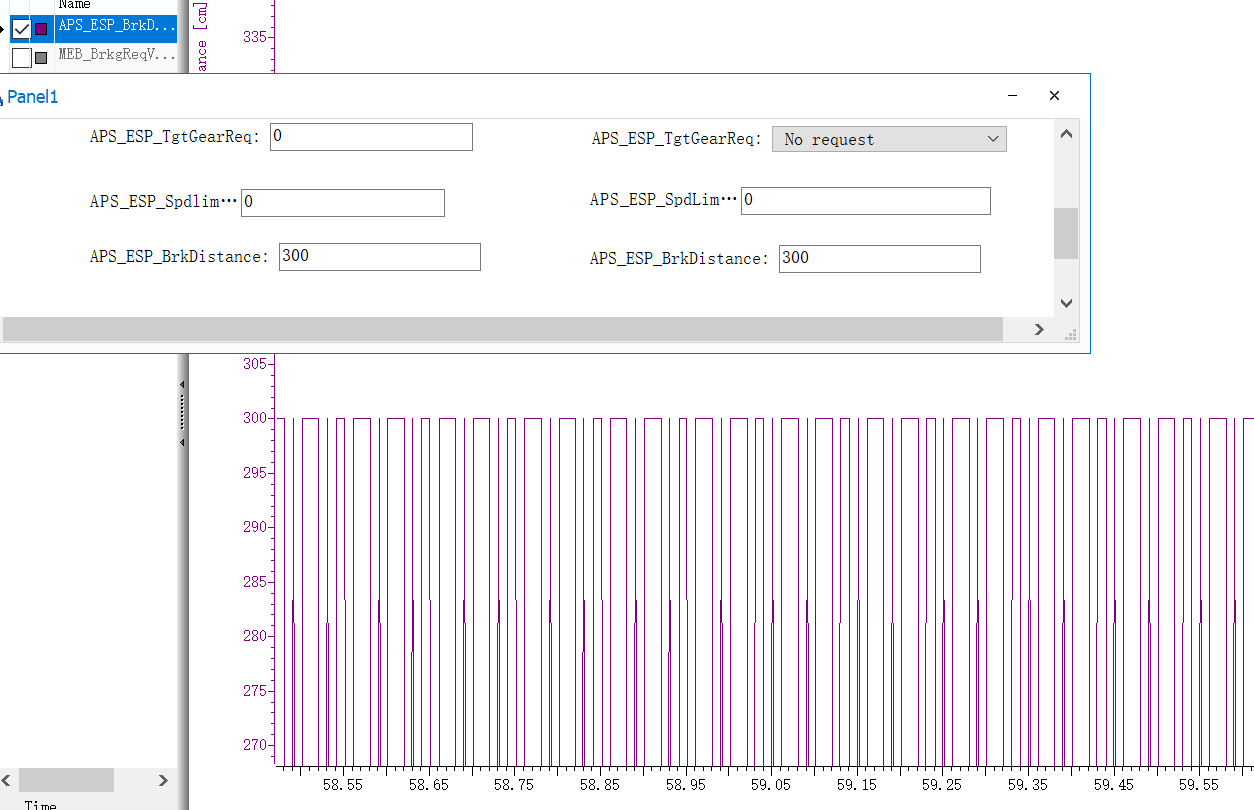 当我开始这个项目时,我将"APS_ESP_BrkDistance“设置为300。我要独木舟总是发送300的信号。但是似乎独木舟正在发送一个默认的消息,这两个信号都是0。