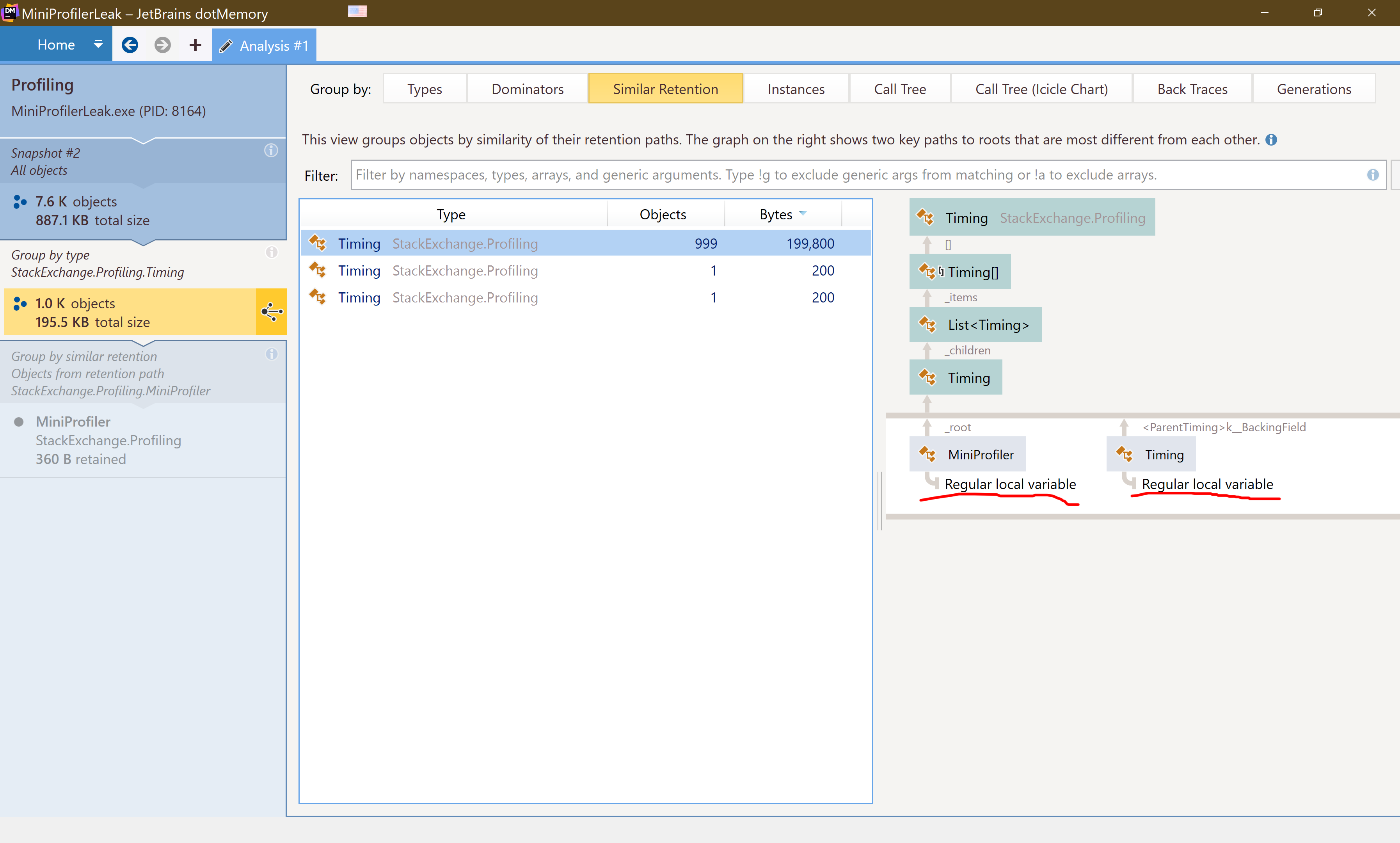 我使用Jetbrains的DotMemory在工作负载前后进行快照。所有1000个时间仍然保留在MiniProfiler的一个实例中,我似乎无法摆脱这个实例。