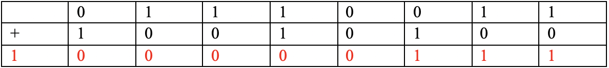 即: 01110011 + 10010100 = 100000111