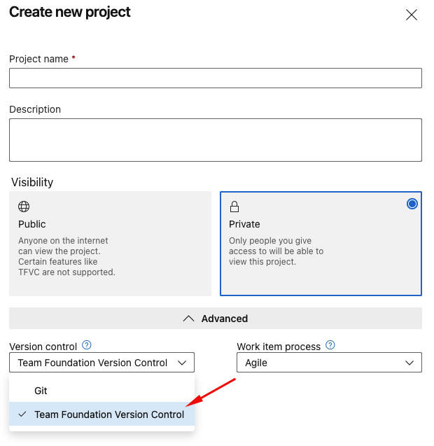在创建新项目时,可以选择要使用的版本控制,可以选择TFVC,并将Azure Repos与TFVS版本控制一起使用: