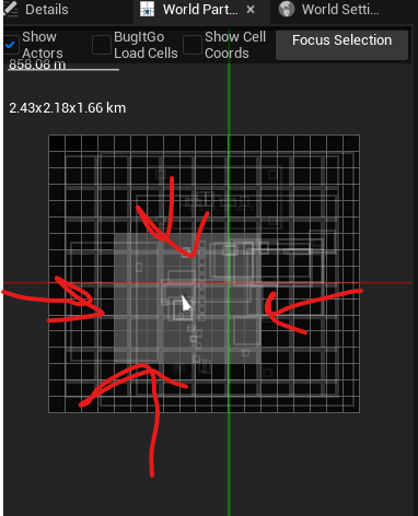 在编辑器中,你可以看到世界的一个迷你版本。白色箭头就是你现在在世界上的位置。单击并拖动要加载的区域内的迷你地图。突出显示的单元格将是灰色的。