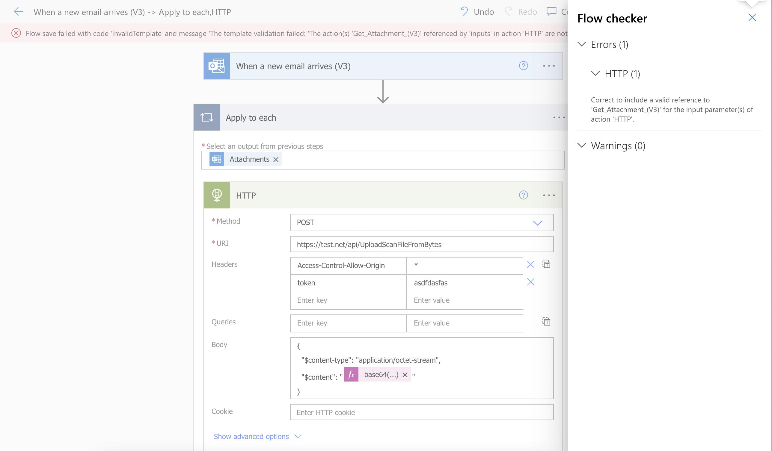 我是电力自动化的新手。我需要阅读我的电子邮件附件,并将每个附件作为base64发送到webapi。我使用下面的表达式将电子邮件附件转换为base64。但是流显示错误为“正确地包含对动作'HTTP‘的输入参数'Get_Attachment_(V3)’的有效引用。