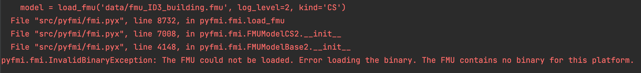 记住FMU基本上是可执行代码的容器,所以它必须是用正确类型的二进制文件创建的。在我看来,这个信息是非常清楚的: FMU不包含这个平台的二进制文件。我建议您首先验证生成FMU的工具是否能够生成正确的二进制文件。