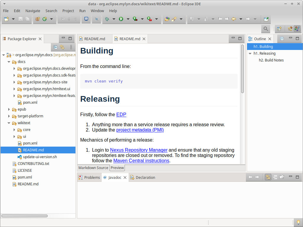 在Windows 10上,我总是通过下载和解压缩Java版本来安装Eclipse。EE版本长期以来一直有一个用于*.md文件的Markdown编辑器。虽然它是一个非常有限的编辑器,但至少它给了我一个简短的预览,并在源代码编辑器中提供了一些样式(尽管它不理解Markdown的任何复杂的微妙之处)。