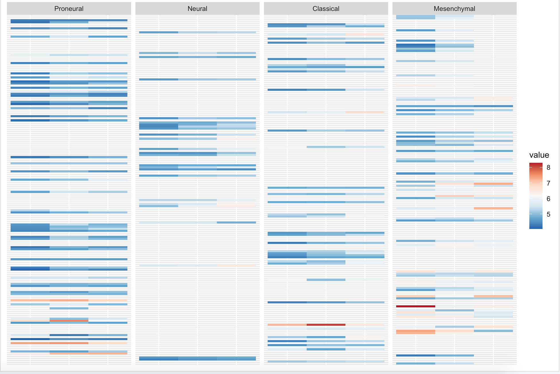 我试图绘制一个热图,但我想要四个不同的垂直区域的热图。第一个是“代表神经”,然后是“神经”,然后是“经典”,最后是“间充质”。