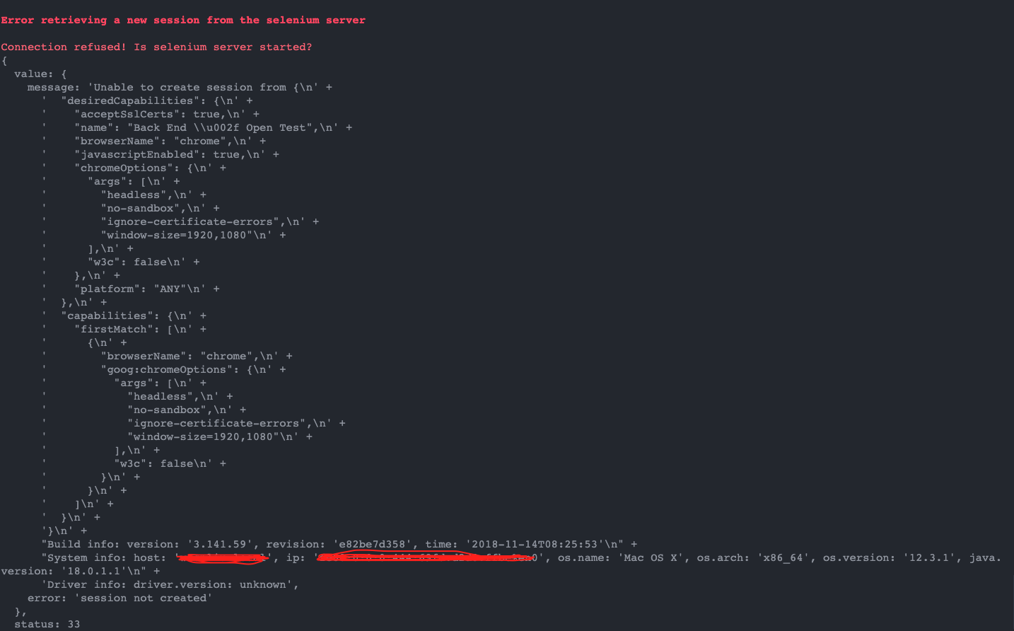 我正在使用nightwatch.js测试网站,当运行Nightwatch附带的google.js测试时,我得到了一个错误:“拒绝连接是启动Selenium Server吗?”而且,嗯,是的。是我挑起的。