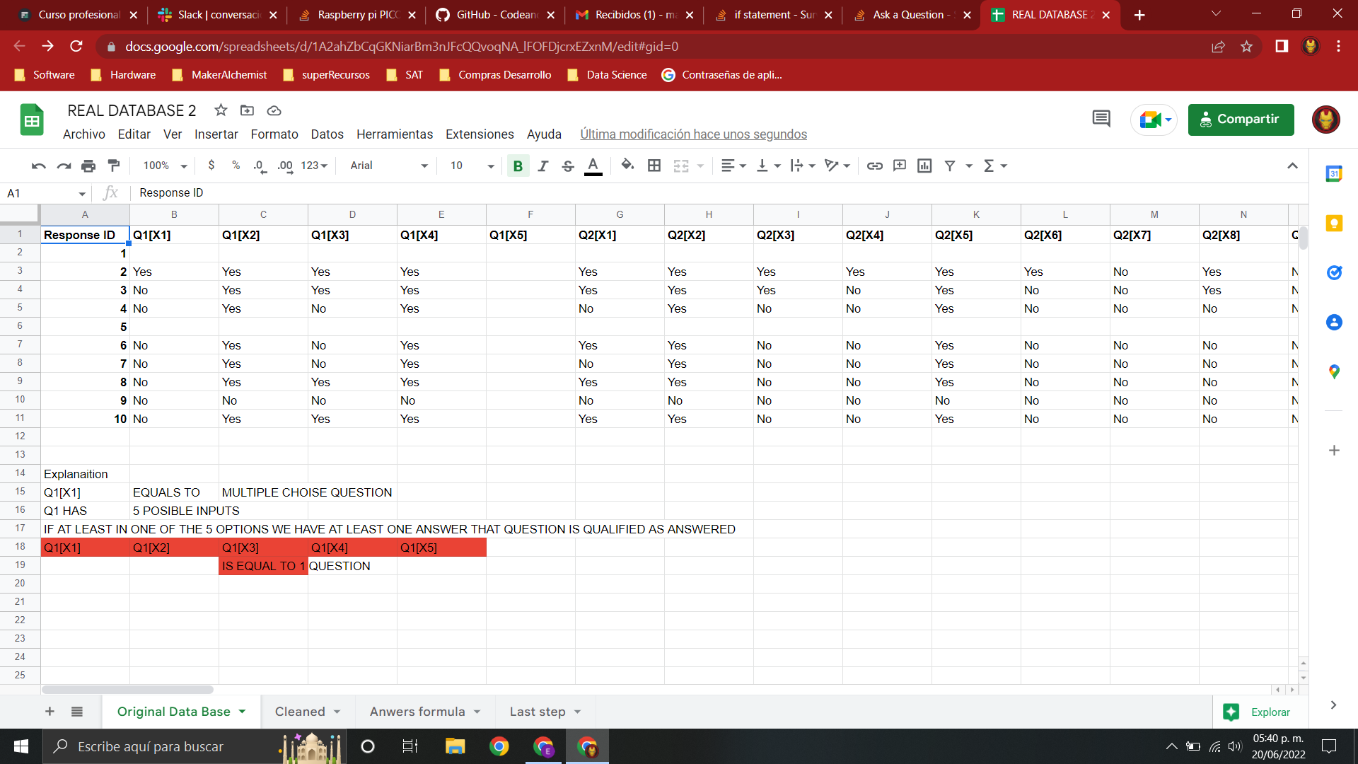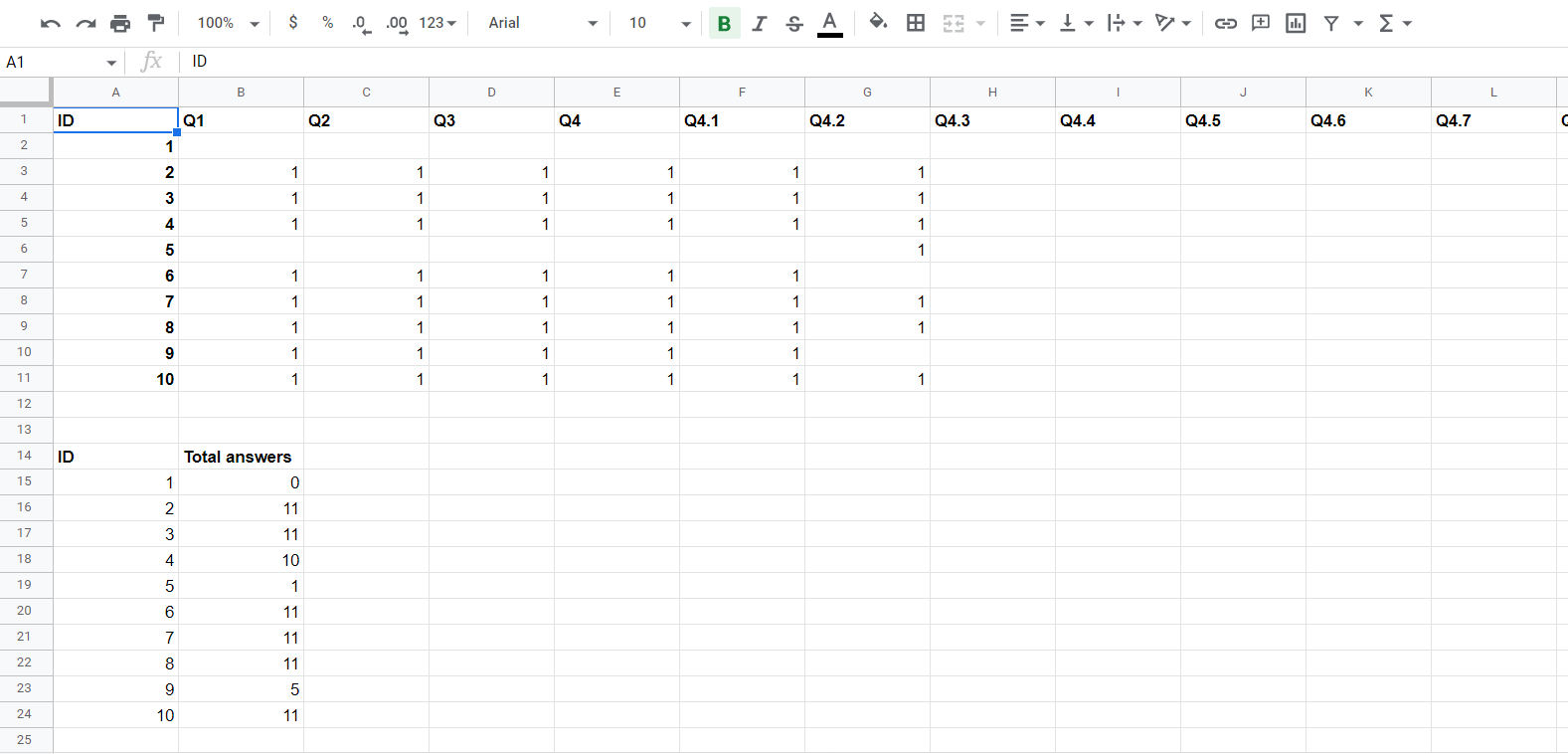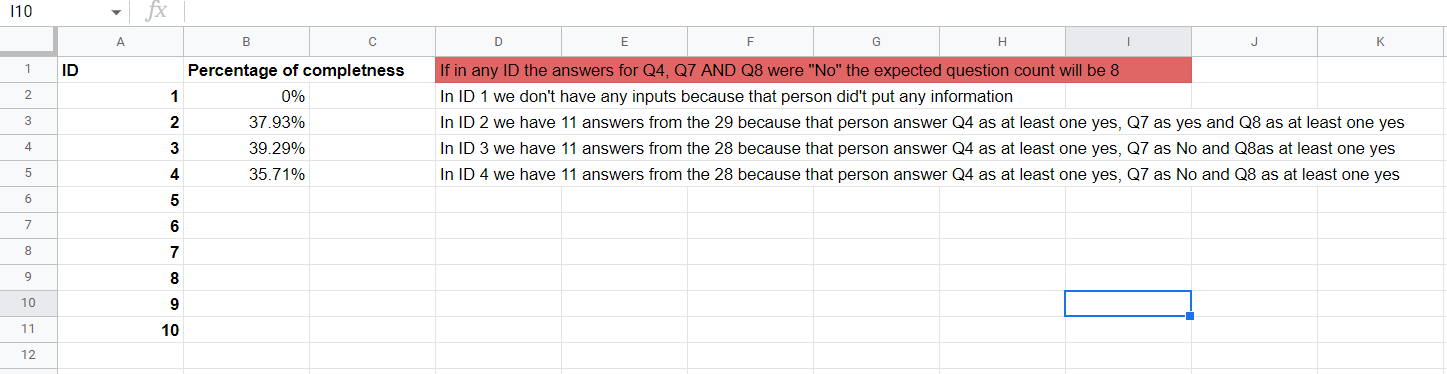 我试图获得一些以Excel格式导出的调查结果的完整性信息。我正在使用谷歌单张,因为每次调查都有问题和子问题,子问题有一个条件,例如: 4.你今天过得怎么样?选择题答案:好,坏,不愿说,所以我们有三个答案选项,如果我们点击好,有一个条件,子问题将是:为什么?