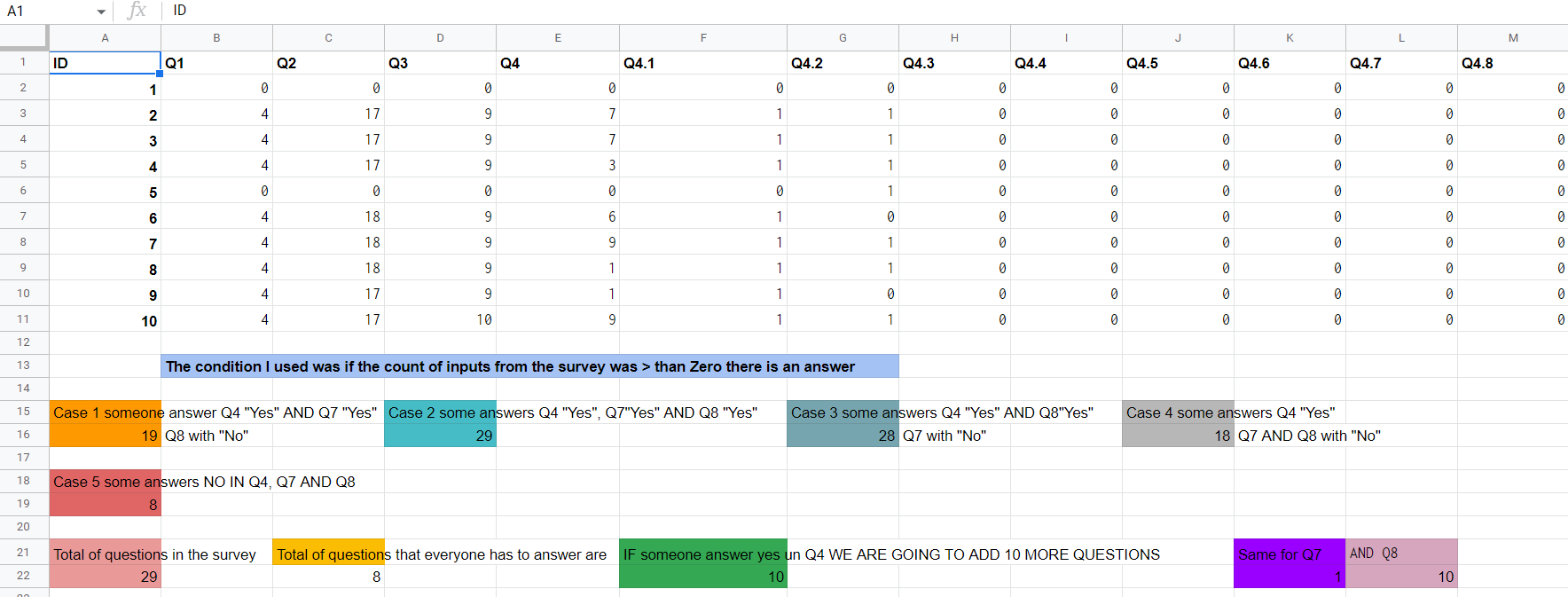 但是,正如我之前提到的,条件影响这个预期答案这个变量是动态的,取决于问题4、7和8的答案。所以我想为每一种情况获得这个变量,如果有人输入了一个ID,如果我们有20个人在做调查,我们将得到20个ID的。