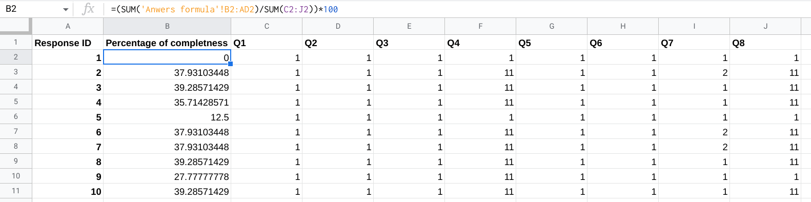 =(SUM('Anwers formula'!B2:AD2)/SUM(C2:J2))*100要解释这个语法->,这将使(Answer count / Number of expected answers) X 100获得百分比。