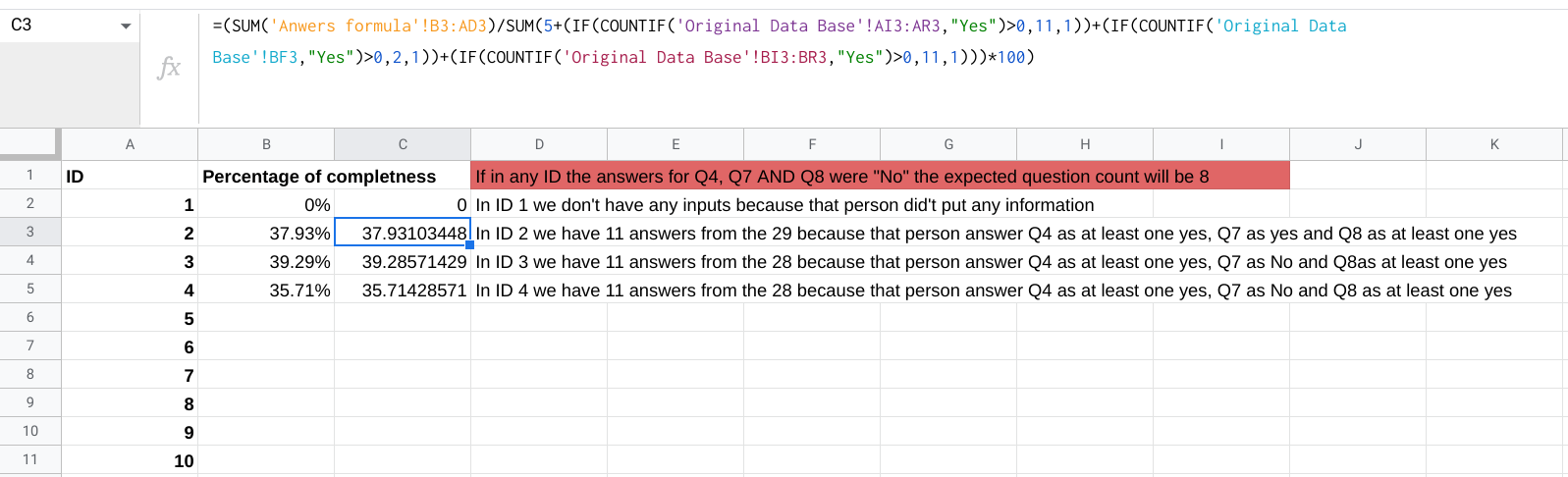 =(SUM('Anwers formula'!B2:AD2)/SUM(5+(IF(COUNTIF('Original Data Base'!AI2:AR2,"Yes")>0,11,1))+(IF(COUNTIF('Original Data Base'!BF2,"Yes")>0,2,1))+(IF(COUNTIF('Original Data Base'!BI2:BR2,"Yes")>0,11,1)))*100)
