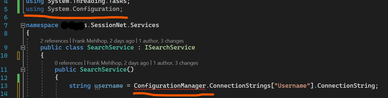 我在班上使用ConfigurationManager。我添加了使用的System.Configuration。使用是灰色的,ConfigurationManager是未知的。为什么我的.NET核心3.1项目不知道System.Configuration.ConfigurationManager?应该是标准的?!