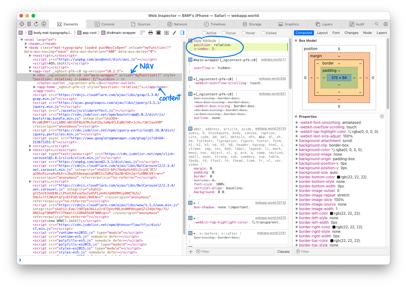 要解决问题,可以将#main-wrapper的z-索引(它是.pushNav的父级)设置为任何高于<app-home>的数字。这是我在我的设备上尝试过的。